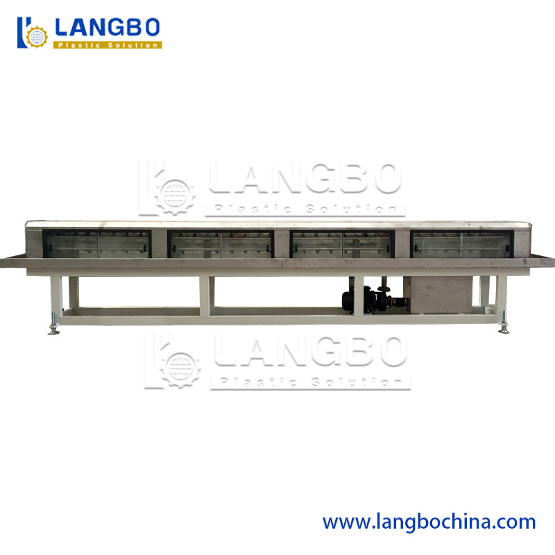 مخزن کالیبراسیون خلاء از ساختار دو محفظه ای استفاده می کند: بخش های کالیبراسیون خلاء و خنک کننده. هم مخزن خلاء و هم مخزن خنک کننده اسپری از فولاد ضد زنگ 304 استفاده می کنند. سیستم خلاء عالی، اندازه گیری دقیق لوله ها را تضمین می کند. ما مخزن خلاء و خنک کننده را به طول 8 متر افزایش داده ایم. با فرآیند خنک کننده طولانی تر، لوله CPVC می تواند به خوبی خنک شود و سطح بهتری داشته باشد.
