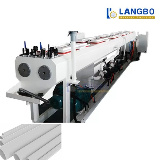 اولین مرحله تولید لوله، آمادهسازی مواد اولیه است. مشتریان میتوانند پودر PVC را با افزودنیهای دیگر خودشان مخلوط کنند. مخلوط به اکسترودر تغذیه میشود. مواد در اکسترودر پلاستیکی شده و سپس به داخل قالب اکسترود میشوند. مواد توسط قالب شکل گرفته و به صورت لوله خارج میشوند. لوله اکسترود شده از قالب داغ و نرم است. لوله با شکل ناپایدار توسط آستین خلاء در مخزن کالیبراسیون خلاء کالیبره و خنک میشود. سپس لوله برای خنککاری بیشتر وارد مخزن خنککاری میشود. واحد کشنده در کنار مخزن خنککاری قرار گرفته و لوله را از اکسترودر دور میکند. بر اساس طول تعریف شده، لوله برش داده شده و سپس برای حمل و نقل بستهبندی میشود.