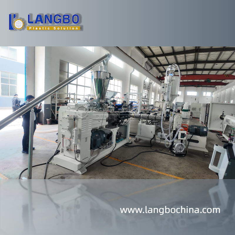 This window and door profile extrusion line features a conical twin screw extruder suitable for both PVC powder and PVC granules. The integrated degassing system ensures excellent material plasticization, while high-speed molds significantly increase productivity.